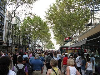 ホテルの目の前にあるランプラス通りは、カタルーニャ広場から海に向かってのびているまっすぐな並木道である。道路の両側はたくさんの店が連なっており、そこをぶらぶらウィンドウショッピングをしているだけでも楽しいと思う。さらにいうと、通りの中心は歩行者専用の並木道になっており、歩行者道の両側に、片側1車線の車が通り道が存在する。だから、ランプラス通りは結構いつも車が渋滞している感じだ。